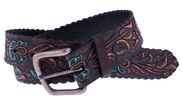 The Western Classic by 3D is just good-looking. The oak leaf and floral tooling on this cowhide belt is highly detailed in dark brown leather, and bordered in saddle tan...