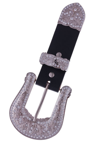Give your favorite belt some first class bling with this elegant three-piece buckle set. The beautiful western floral design is set with sparkling crystals. Includes buckle, keeper and tip. For...