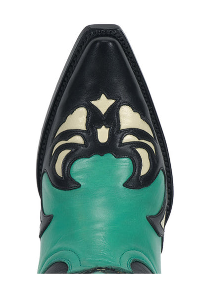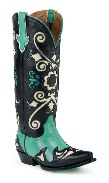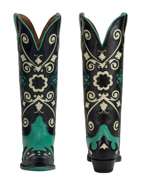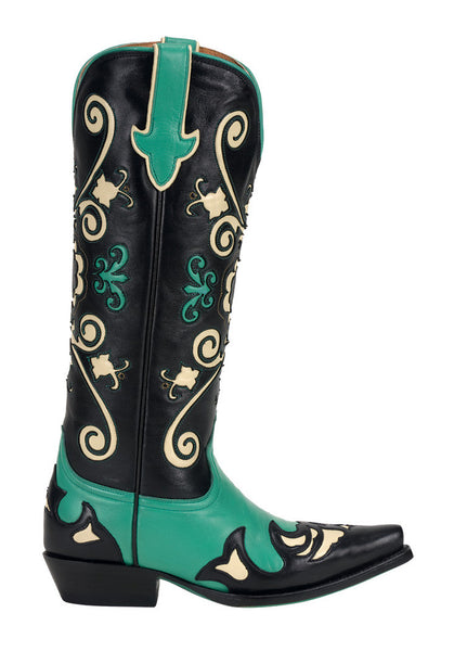 Margaret is Lane Boots' original style, and this lovely pair can be yours. She is the royalty of cowgirls, with classic inlay styling that is a true work of art. The rich turquoise-on-black leather is brought to life with white scrolling inlays. It's a vintage look with modern flair. Lane Boots feature cushioned insoles for extra comfort, flattering snip toe design, side pulls, and their signature turquoise outer soles. Heel height 1.75 inches, shaft height 15 inches.