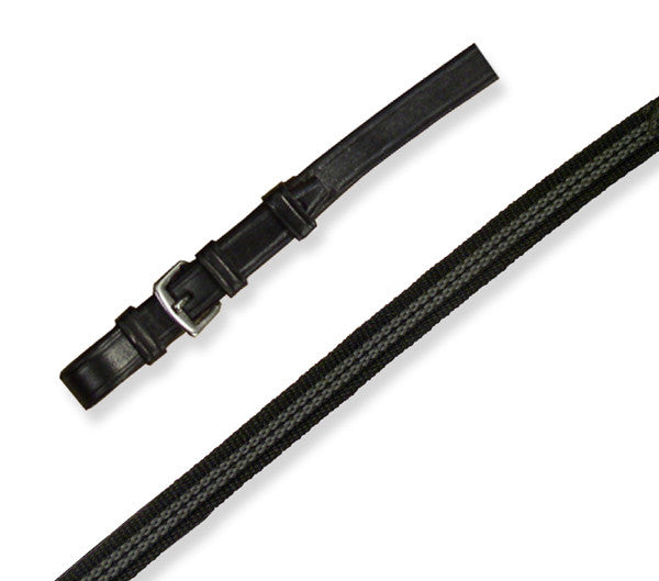 McBride Rubber Lined Reins a cotton web rein with a woven-in rubber grip pattern and hand stops. A durable, grippy rein. Buckle ends, 5/8" width. McBride™ bridle parts are made of the finest English and European leathers and stainless steel hardware. Full, top grain leather is the strongest, most durable part of leather. McBride leather is aniline finished - never pigment (painted) finished. (Paint can cover flaws in leather and seals the surface, stopping proper penetration when you oil your tack.) We use only first quality hides, tanned and curried to look good, accept oil and darken and mellow as you use your tack. The stainless steel hardware is polished, strong and rustproof.