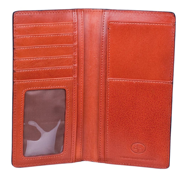 This handsome checkbook wallet from 3D Belts has an Old West feel. It's crafted of supple dark tan leather with a handtooled basketweave pattern, and contrasting blackened background and edges. The scalloped corner is set off with a rustic star badge in gold and silver. It features multiple card slots, checkbook slots, an ID window and photo keepers. Boxed for presentation, 7 1/8 x 3 3/8 inches.