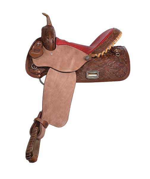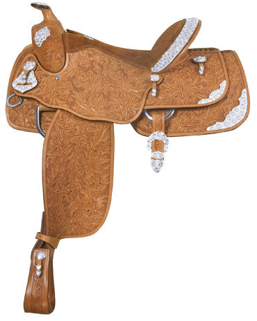It's your time to shine in this rich-looking Floral Tooled Show saddle. It's beautifully tooled with a classic all-over floral design. It features scalloped jockeys, a tan seat, and tooled...