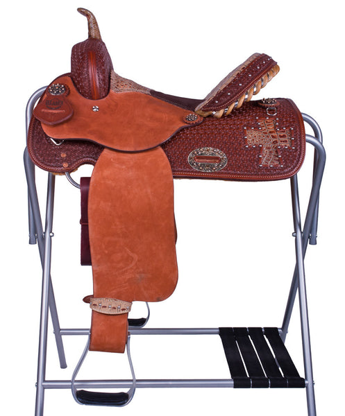 Working saddles from Alamo are rock-solid. The Basket-Tooled Bowman features roughout jockeys and fenders for grip and long wear, classic basket-tooled skirts, tan suede seat, and rawhide-covered, laced stirrups. Silver...