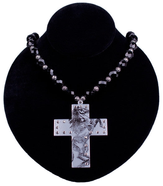 Impressions by Relative Jewelry are refreshingly creative. This metal cross pendant in silver is imprinted with a wild Bronco, studded with crystals and suspended from a chain of black faceted Czech beads and silver rose beads. Approximately 16 inches long with lobster clasp. The pendant is 3 x 2 inches.