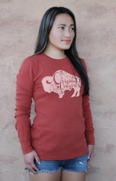 The Original Cowgirl buffalo graphic really makes this wonderful, cozy shirt. Soft, fine thermal tee with earth-toned graphics. Long sleeves, crew neck, Junior fit. Cotton/polyester blend.
