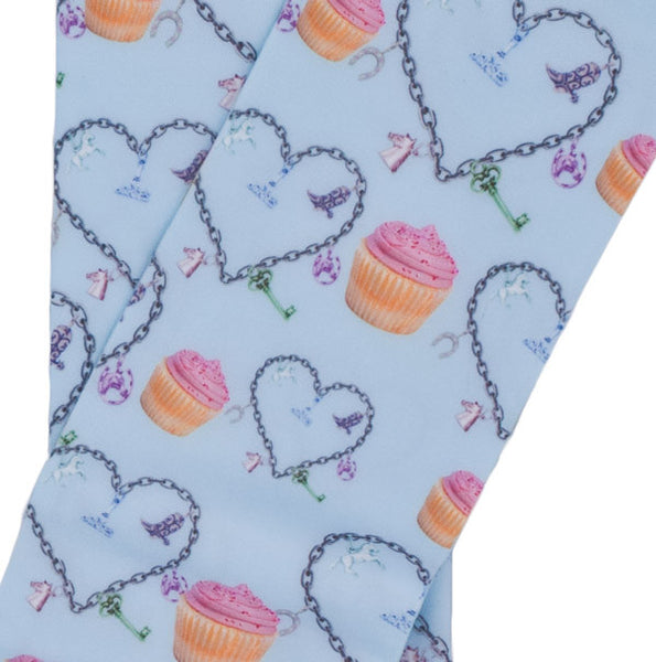 Silky soft, comfortable and colorful, you'll love Equestrian Couture boot socks from Inkstables. Sweet cupcakes and charm bracelets are charming for sure on light blue. Printed designs on 85% nylon/15% Spandex blend. Below-knee height. For Tweens, shoe sizes 13 to 4. Made in USA.