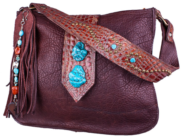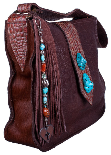 The Deborah shoulder bag is a masterpiece in supple, durable, dark brown buffalo, with hair-on-hide sides and bottom, croc textured shoulder strap and magnetic snap strap with top zip closure. It's studded with show-stopping turquoise nuggets, and finished with antique hardware, a free-form fringe, and unique semiprecious stone bracelet that you can wear or leave for an ornament on the bag. You'll have years of use, beauty, and of course, compliments. Fabric lining with inner pocket. 11 x 13.5 x 4 inches.