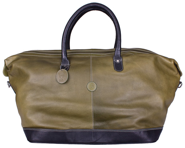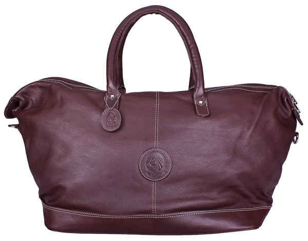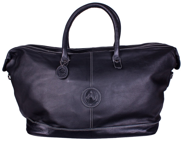 Lilo's Hamptons Weekender Leather Duffle is ideal for travel or horse shows. It's a practical luxury that will last a lifetime, handcrafted of soft grain leather with contrasting stitching. Features include rolled handles, signature Lilo horsehead patch, sturdy zip closure and hardware, 5 metal feet to protect the bottom, fabric lining, inside organizer pockets, and detachable shoulder strap. Brown and Black duffles include bonus change purse. Measures 13.5 inches high x 26 inches long x 10.5 inches wide. Reinforced bottom panel is 17.5 x 10.5 inches. Made in Spain.