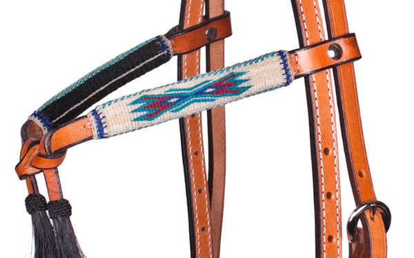 Our Horsehair Crosstie Bridle from Colorado Horsehair is naturally stunning. The unique hitched horsehair in The Rodeo Special design with turquoise, blue and red, accents this quality handmade bridle. The crosstie browband is completed with twin black horsehair tassels. Standard Horse size.