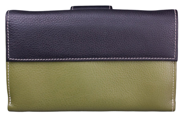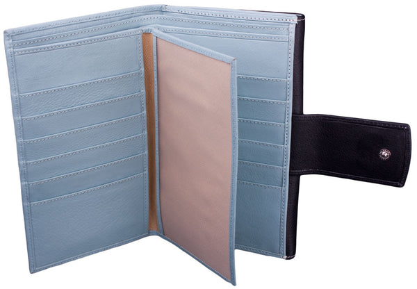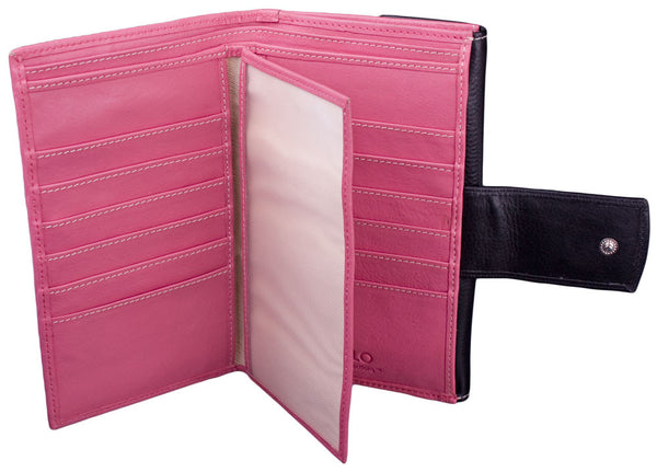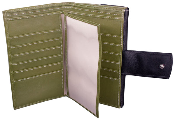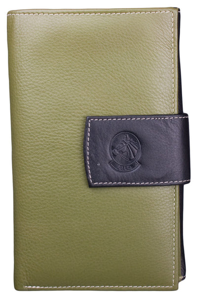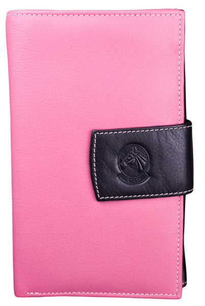 The gorgeous Lilo Checkbook Wallet comes in vivid colors to match many Lilo handbags. It's generously sized in glove-soft grain leather to hold everything you need. There are plenty of card slots and inner pockets. The outer accordion pocket has a hidden zip change holder and contrasting snap flap closure. The contrasting front snap strap closure is embossed with the Lilo horsehead logo.
