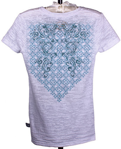 The May tee is as fresh and cool as a summer breeze. This burnout short sleeve tee has the perfect scoop neck and the perfect long, lean fit. It's decorated front and back with flowing designs in shades of aqua, and accented with crystals for just a bit of sparkle. In soft 60% cotton/40% polyester blend.
