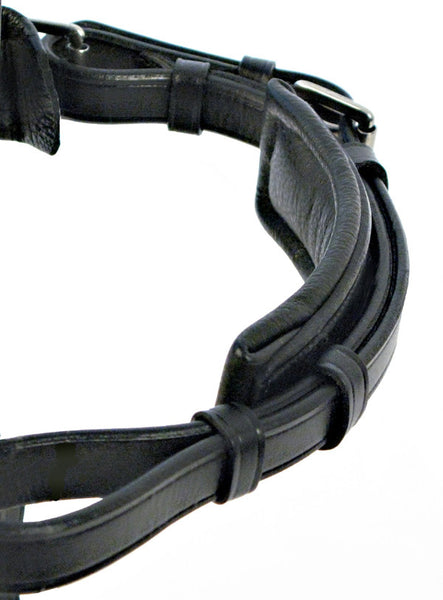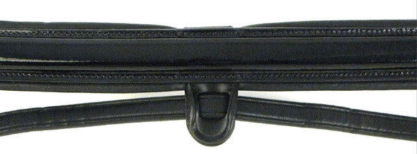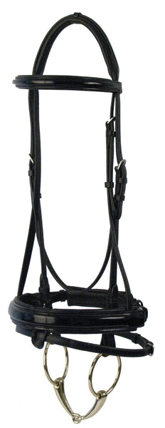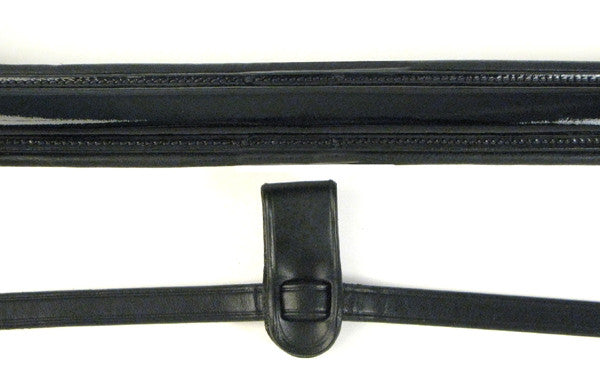 Smith-Worthington's Patent Dressage Bridle is an exquisite, dressy bridle with just a touch of genuine patent leather on the brow and nose. The crown, brow and nose are softly padded. The crank noseband features S-W's new slotted flash attachment that can be removed without leaving a loop or mark, giving you two cavessons in one. Buckles. Leather reins with stops.