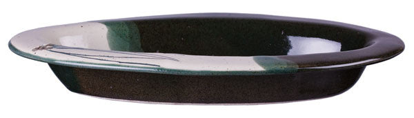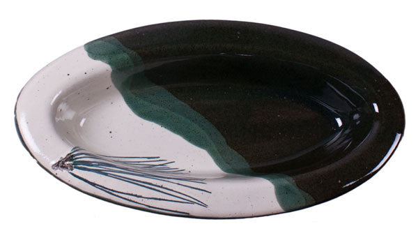 The Pine Needles Oval Baking Dish takes its inspiration from nature. Rich glazes in natural colors are accented with imprints of genuine Mountain Pine needles on this stunning oval bowl that's perfect as a baking dish, serving bowl or display piece. Measures approximately 15 x 7.5 inches outside, 12 x 5 inches inside, and is 2 inches high. Oven and dishwasher safe. May ship from Canyon Creek Saddlery or Davy Pottery.