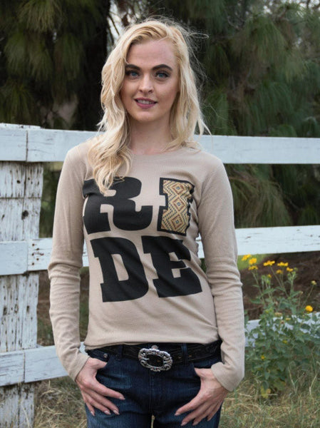 The bold RIDE graphic says it all on this wonderful, cozy shirt. Soft, fine thermal tee in ecru with black and earth-toned graphics. Long sleeves, crew neck, Junior fit. Cotton/polyester blend.