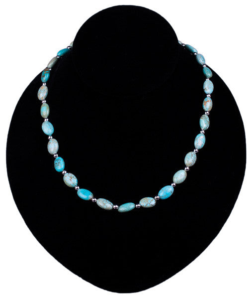 This necklace of turquoise Robin's Eggs and silver beads is simple, beautiful and natural. Lovely on its own, or as an accompaniment to layering with other pieces. Approximately 16 inches, with lobster clasp.