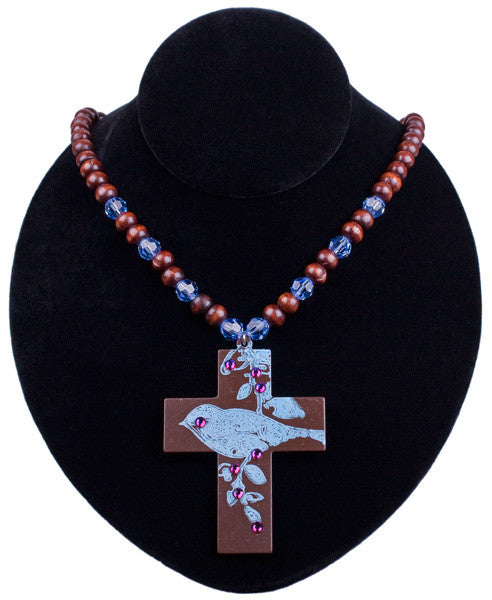 Impressions by Relative Jewelry are refreshingly creative. This metal cross pendant in bronze is imprinted with a charming Bluebird, studded with crystals and suspended from a wooden and blue crystal...