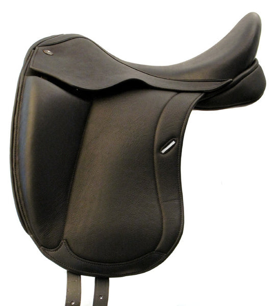Helix is an exciting new saddle from the Stellar line by Smith-Worthington. Designed for horses with well developed shoulders, this extremely close contact monoflap design dressage saddle has short, "whippy" panels with a wide gullet for broad spines. The skirts and flaps, with molded blocks, are supple glove tanned cowhide over a thin foam layer for comfort and contact. Made in Argentina to Smith-Worhtington specifications. 30 year tree warranty. Features include:
