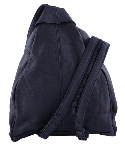 The Three-Front Backpack is appropriately named for its three front zip pockets. You'll love how easy it is to keep those important things, keys, phone, lip gloss, where you can get right them. The main compartment opens with a large size zip for quick access. The adjustable straps zip together for one-shoulder carry, and apart for backpacking. This incredibly useful little pack is all dressed up and ready to go in soft grain leather. Measures 11 x 9 x 4 inches.