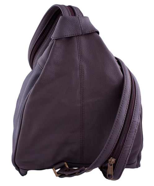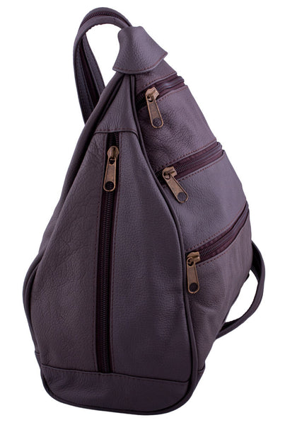 The Three-Front Backpack is appropriately named for its three front zip pockets. You'll love how easy it is to keep those important things, keys, phone, lip gloss, where you can get right them. The main compartment opens with a large size zip for quick access. The adjustable straps zip together for one-shoulder carry, and apart for backpacking. This incredibly useful little pack is all dressed up and ready to go in soft grain leather. Measures 11 x 9 x 4 inches.