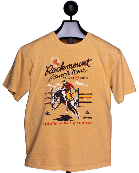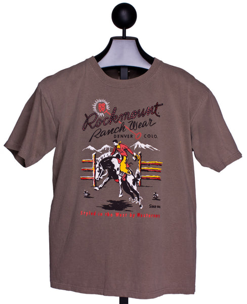 This Vintage Bronc Tee Shirt from Rockmount Ranch Wear is one you can really live in. The vintage bronc buster graphic is an original, time-honored Rockmount design, on a soft but substantial, pigment-dyed 100% cotton tee.